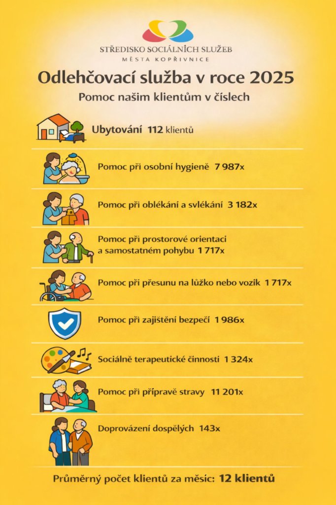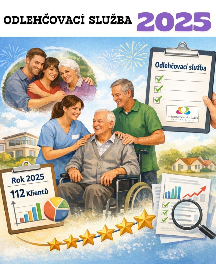 Rok 2025 byl pro odlehčovací službu opět úspěšným rokem. Poskytli jsme péči 112 klientům a jejich rodinám jsme tak pomohli zajistit potřebný odpočinek. Služba je dlouhodobě velmi žádaná a setkává se s velmi pozitivními ohlasy jak ze strany klientů, tak jejich rodinných příslušníků. Zároveň se nám daří dlouhodobě udržovat vysoký standard kvality poskytované péče. Pro informace o konkrétních číslech a statistice služby rozklikněte obrázek pod příspěvkem.
